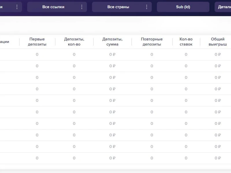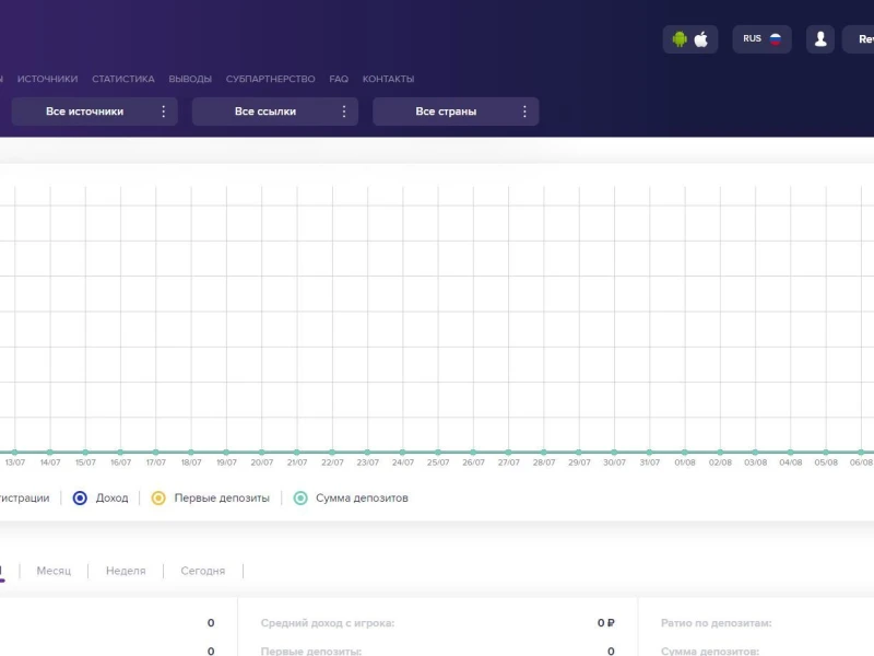 В дашборде ЛК 1WIN PARTNERS абсолютно ничего лишнего, только статистика за календарный месяц — количество переходов, регистраций, первых депозитов, а также общий доход и общая сумма депозитов. Данные можно фильтровать по дате, источникам, ссылкам и ГЕО.