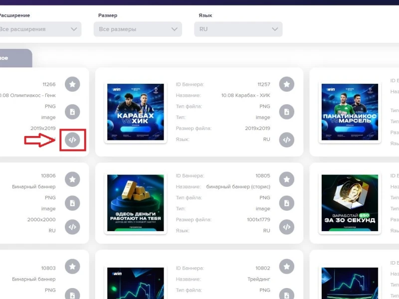 - Промоматериалы. Среди имеющихся промок — сочные мультиязычные баннеры разных форматов (статичные картинки, гифик, видеобаннеры) и размеров, промокоды и прямые партнерские ссылки. Можно также заказать разработку индивидуальных креативов.